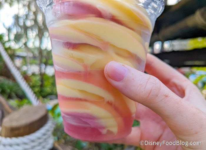 With that being said, though, we do think this snack is a better bang for your buck because you CAN taste the alcohol. We also feel like the swirl is a better way to enjoy DOLE Whip flavors over the Hei Hei Cone and the Montunui Island Twist, which are also both available here. It comes in a cup, so you don’t have as much of a melting problem like you do with the cones.
