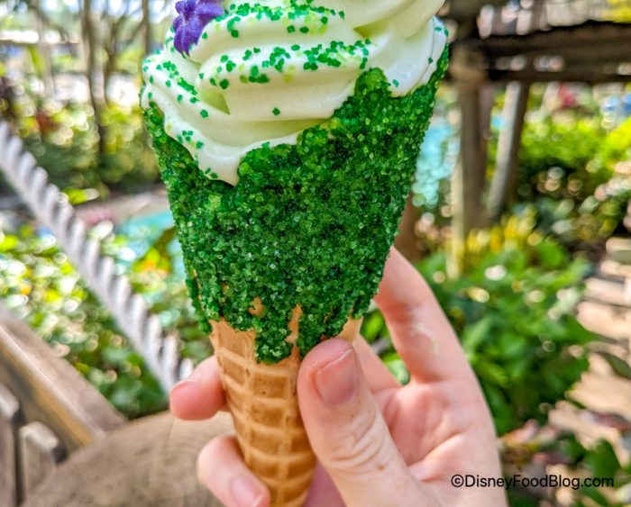 One of those snacks is the Montunui Island Twist, which is a brand new Dole Whip snack! So, OBVIOUSLY, we had to try it out because that’s what we do. It’s made with Dole Whip Lime soft-serve, edible flowers, and green sprinkles! Isn’t she beautiful? 🥲