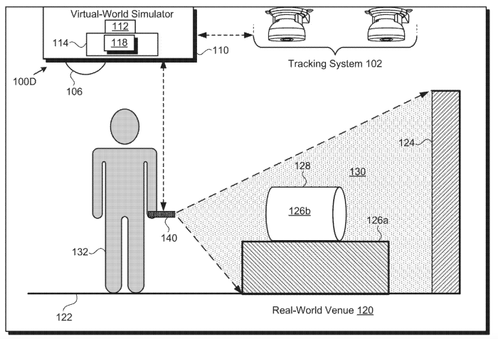 Claim 10 in Disney’s patent hints that the projection device will “simulate a virtual-world by conforming the identified virtual effects to the geometry of the real-world venue from a present vantage point of the tracked moving perspective.” Then, in claim 11, the language gets more specific, hinting that the projection device may be a 3D map that follows your movement! This would allow the system to make sure it’s adjusting to your view and keeping things realistic for you.