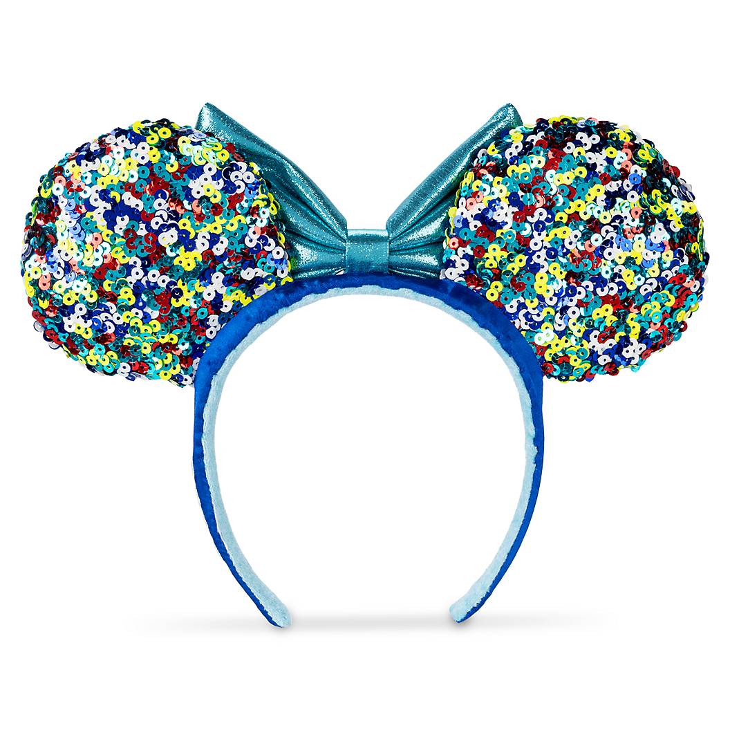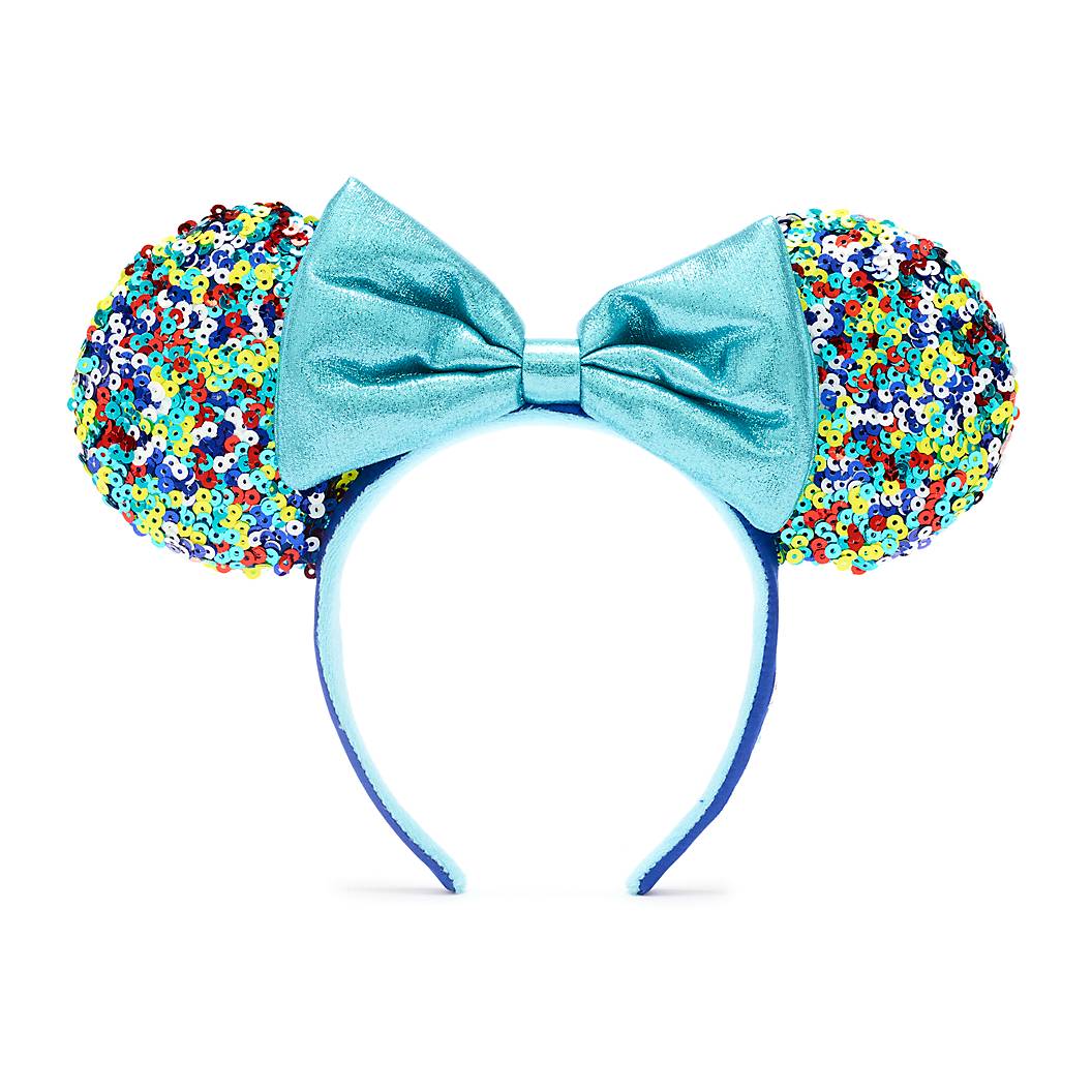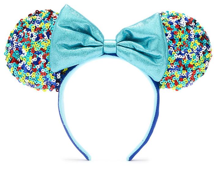 The ears the individual is wearing has a turquoise bow in the center and there are multi-colored sequins covering the ears.
