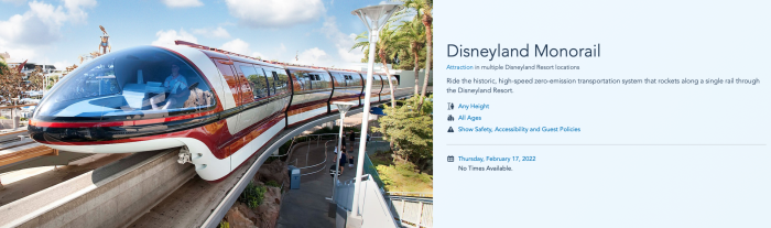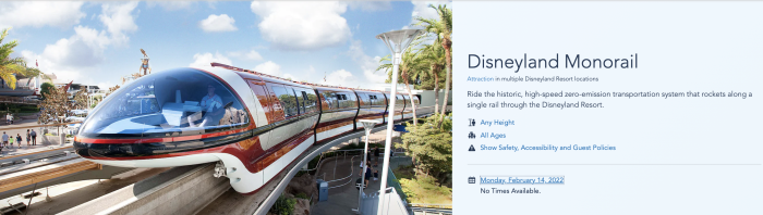 On Disneyland’s website, the Monorail is not showing any times (meaning that the ride would be unavailable to guests) starting on February 14th.
