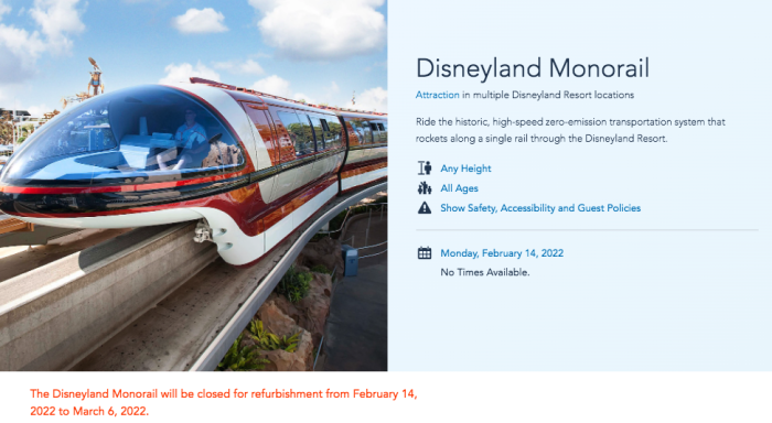 UPDATE: The Disneyland website has now been updated to list the dates for the Monorail’s closure for refurbishment. It now indicates that the Disneyland Monorail will in fact be closed from February 14th through March 6th, 2022. We’ll check for more updates.