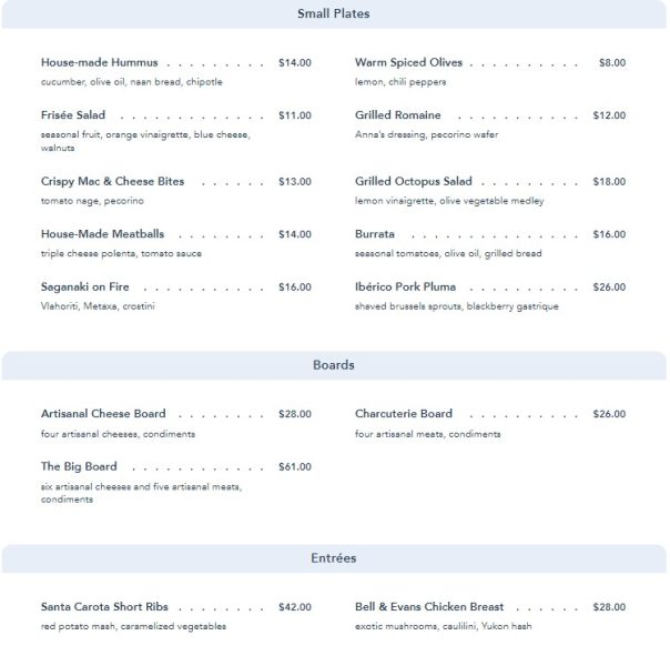 Similarly, Wine Bar George also serves small plates, intended to be sampled and shared with others. Their menu is a bit smaller and hosts some more familiar options. It starts out with Small Plates, Boards, and some Entrées…