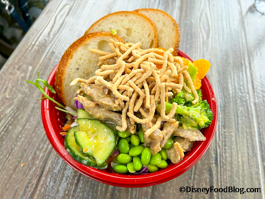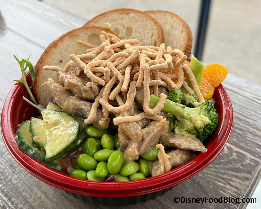 Okay, are you sitting down? Because — wait for it — we ate a salad at Disneyland. A SALAD! Yep, you heard us right. It was an Asian Chicken Salad made with Red and Green Cabbage, tossed in Miso Dressing with Mandarin Oranges, Edamame, Broccoli, and Cucumbers served with Chicken and Sliced Sourdough. A SALAD.