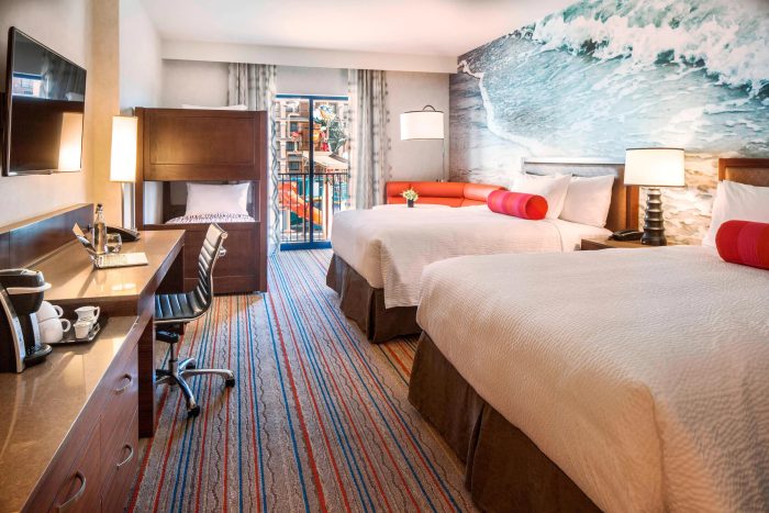 Unlike other hotels in the area, each room sleeps up to six people and comes with two queen beds and a bunk bed making it ideal for larger families. Plus, the Courtyard by Marriott is one of the only hotels that features TWO showers in the room to make your morning or bedtime routine easier with kiddos.