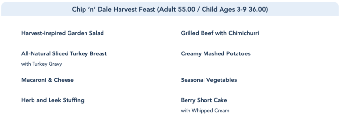 This is the current lunch and dinner menu. Note that previously, Garden Grill offered a family-style breakfast as well with the same characters. It has not returned at this time, but we’re keeping an eye out. We can’t wait to dig in!