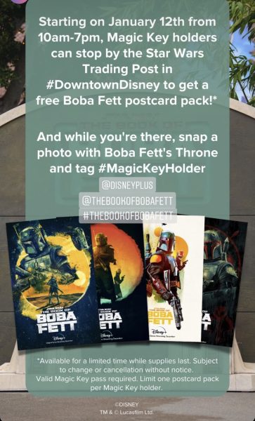 If you’re a Magic Key holder, however, you’ll want to make sure you redeem a special giveaway just for you! Starting today, January 12th, Magic Key holders can get a FREE Boba Fett postcard pack at Star Wars Trading Post. The postcards will be available from 10AM-7PM while supplies last.
