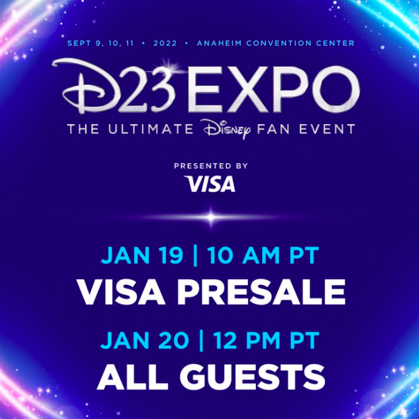D23 members who are Visa cardholders and who pay with their Visa can access a limited number of 1-day and 3-day tickets for 24 hours starting on January 19th, 2022, at 10AM PT, while supplies last. The D23 Expo Preferred Seating tickets will not be part of this pre-sale.