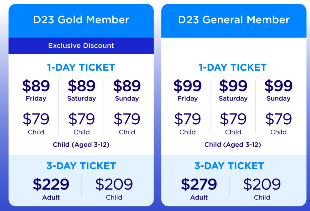 D23 General Members can get the regularly priced single-day tickets at $99 and 3-day tickets for $279.