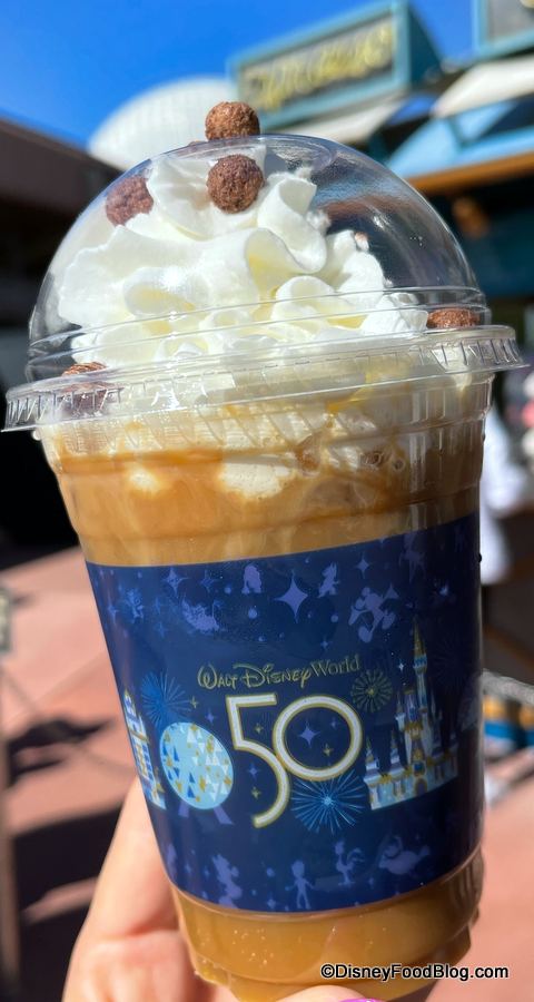 At the World Discovery Joffrey’s location near Mission: Space you can find the Mocha Masterpiece Cold Brew, which is a Cold Brew topped with Whipped Cream and Chocolate Puffs! This drink is $6.39, but you can also get the drink with alcohol, which is $13.99.