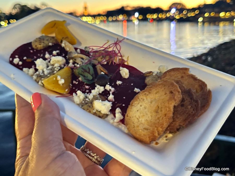 First up we have the Blood Orange-braised Beet Carpaccio with Mustard Vinaigrette, Pickled Clamshell Mushrooms, Golden Beets and Crostini. You’ll find this over at the Gourmet Landscapes booth. This dish is plant-based and is new to the Festival this year. This item will set you back $5.50.