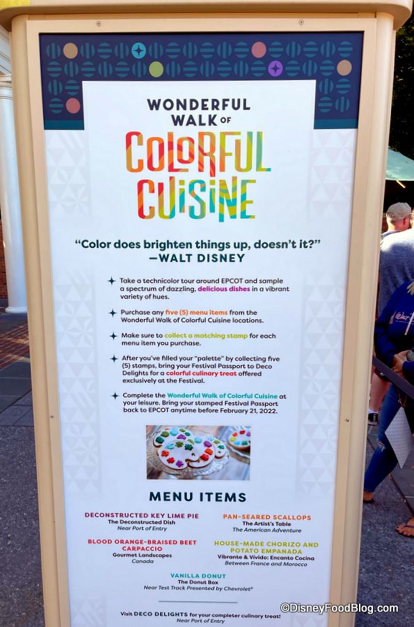 During the Festival of the Arts, Disney offers something called the Wonderful Walk of Colorful Cuisine. This is an activity we’ve seen offered at the Festival in the past. Much like the Cookie Stroll during the Festival of the Holidays, the idea here is to buy (and enjoy) items from specially marked spots which are part of the Wonderful Walk of Colorful Cuisine.