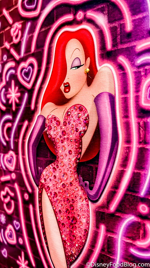 We were over at Art of Disney when we spotted this Jason Ratner Jessica Rabbit piece! We actually weren’t given that much of a choice as to whether or not we would spot it because this thing is so bright, we could have seen it from a mile away!