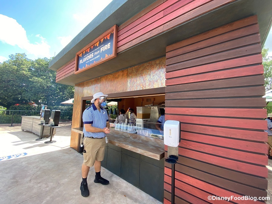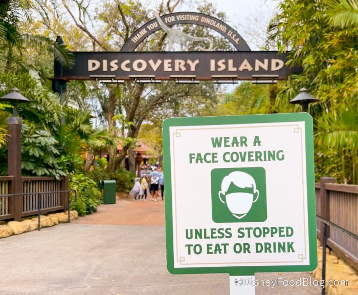 The new guidelines stated that guests must be “stationary and maintain appropriate physical distancing” while eating or drinking in order to take off their masks. We also noticed new signage reflecting this update and the overhead announcements throughout the parks were changed to include the new policy.