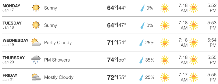 When we reach the midpoint of the week, the weather is expected to be a little warmer than the day before! Wednesday, January 19th, has a high in the 70s and a low in the 50s, which should make for a pretty comfortable day in the parks!