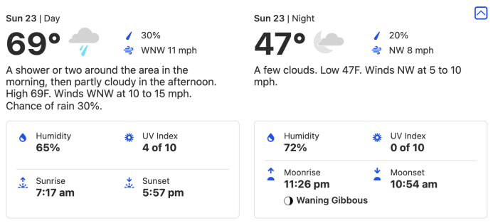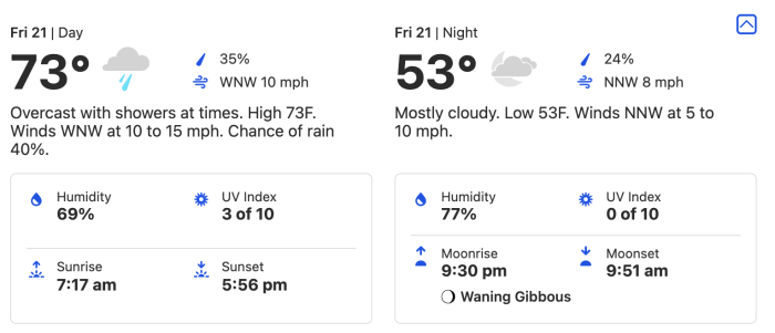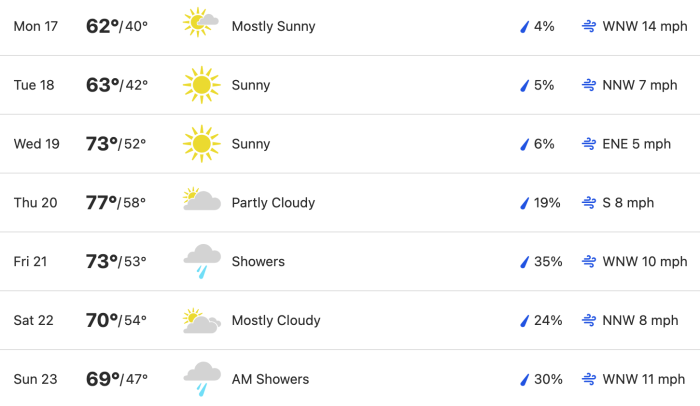 The wind doesn’t look too harsh, but there will likely be a slight breeze to keep you cool. As you can see, though, the temperature can start around 70 and go all the way down to 50 by the evening!