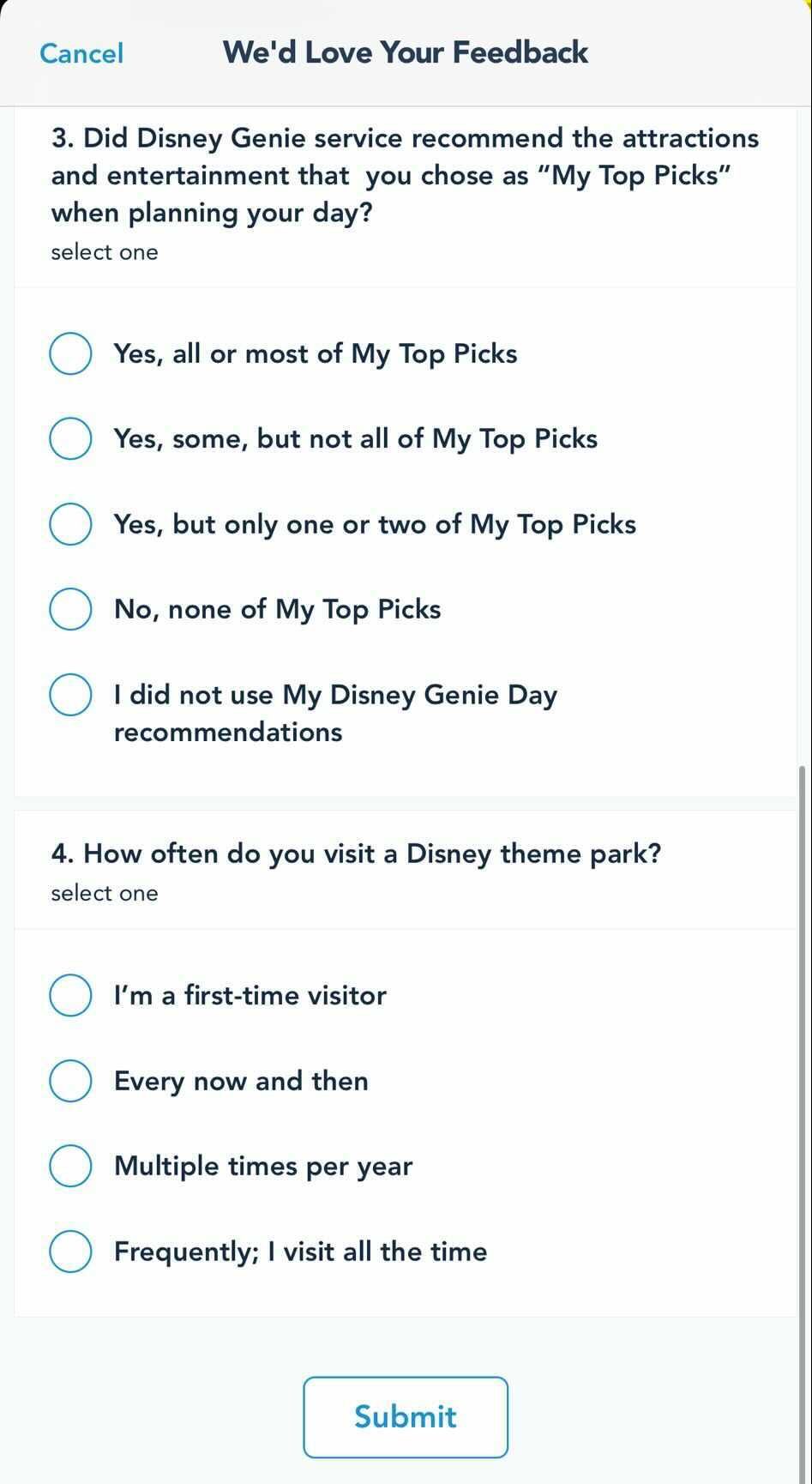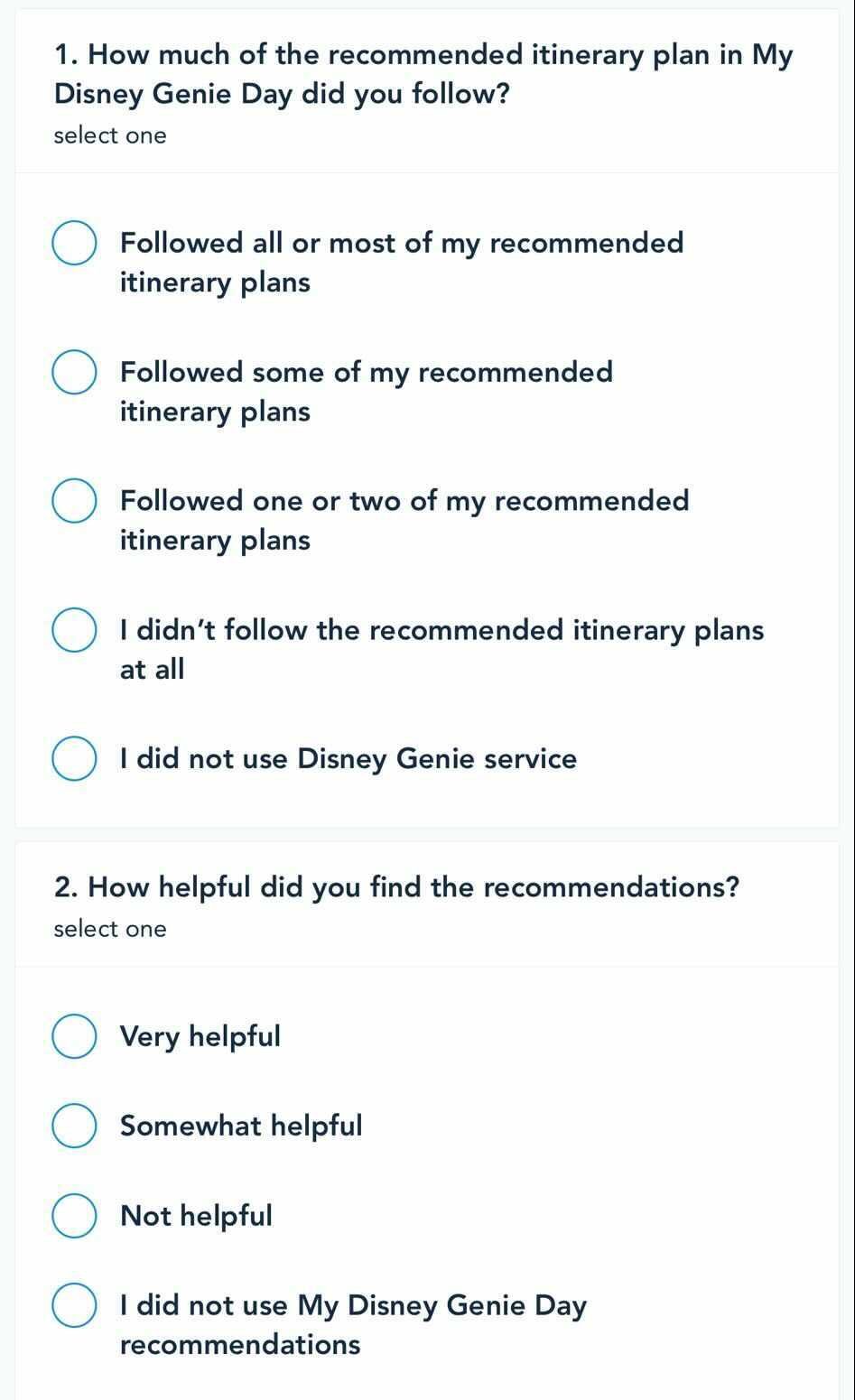 This Disney Genie survey popped up for us recently in the My Disney Experience app, after clicking into the service earlier that day. Genie has garnered some mixed reactions, but it looks like Disney wants to check in and see what guests are thinking. The questions are about the recommended itinerary plan that Genie customizes for you, and how well it works.