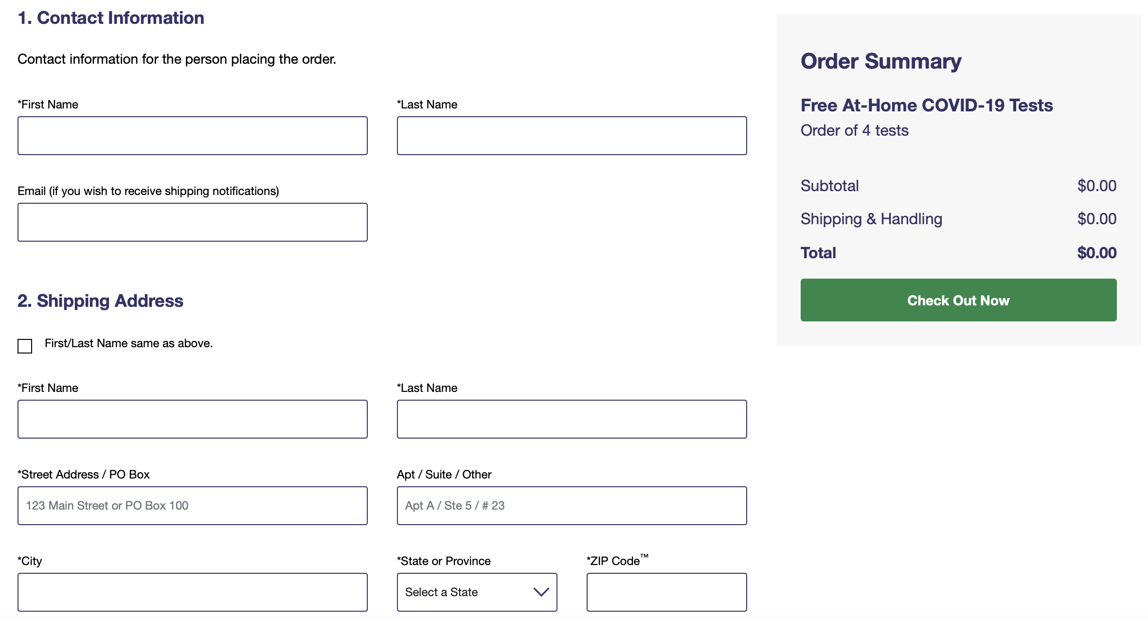 To order the tests, simply go to COVIDtests.gov and hit “Order Free At-Home Tests” you will be redirected to the United States Postal Office website, where you can enter your contact and shipping information and then place your order.