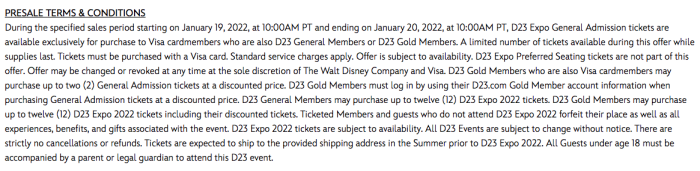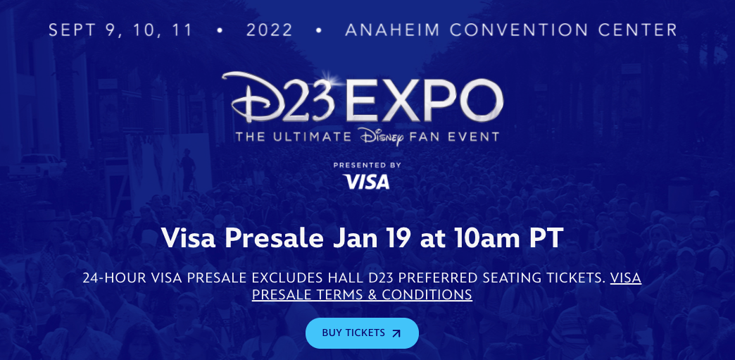 During this pre-sale, D23 members who are also Visa cardholders can visit the D23 Expo website to buy their tickets before everyone else! Note that only D23 Gold Member tickets and D23 General Member tickets will be available during this pre-sale. The exclusive (and expensive) Hall D23 Preferred Seating option will NOT be available during the Visa pre-sale.