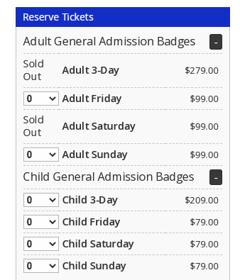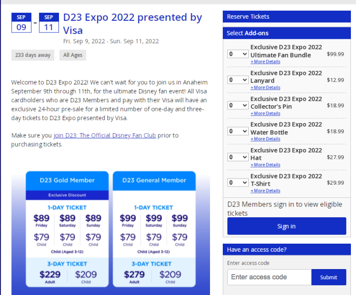 It then prompted D23 members to sign in to view eligible tickets. After signing in we were able to see that the adult 3-day tickets and the adult Saturday tickets were already SOLD OUT as part of the Visa pre-sale. Other tickets were still available.