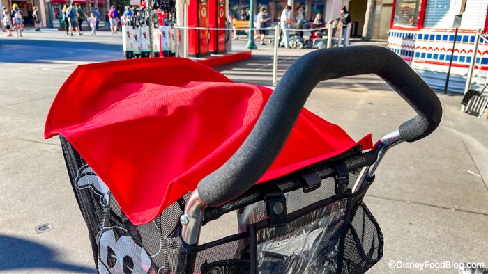 We spotted these new strollers today at Hollywood Studios today and they are so cute! They feature a red, black, and yellow color scheme and this new design will be replacing the previous plain beige strollers.