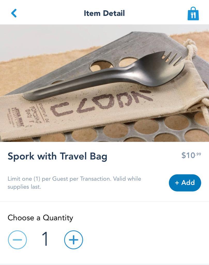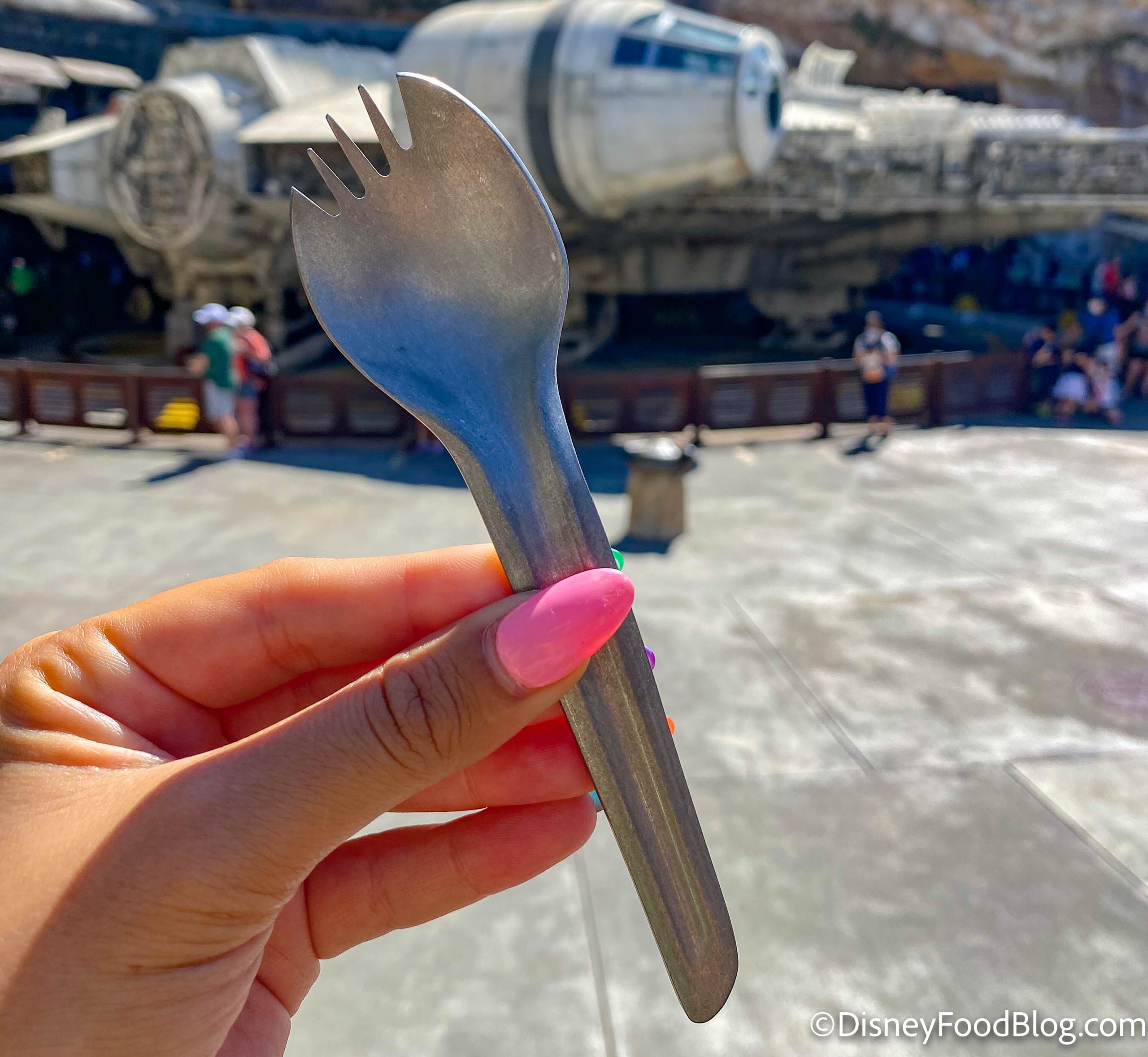 These babies have a complicated past. At first they were available for guests to use at Docking Bay 7. They then experienced some problems when guests didn’t exactly want to part ways with them after eating. The sporks were taken away and regular utensils were put in their place. But they then became available for guests to purchase. This is similar to the pattern of events that took place in Disneyland when their version of Galaxy’s Edge opened.