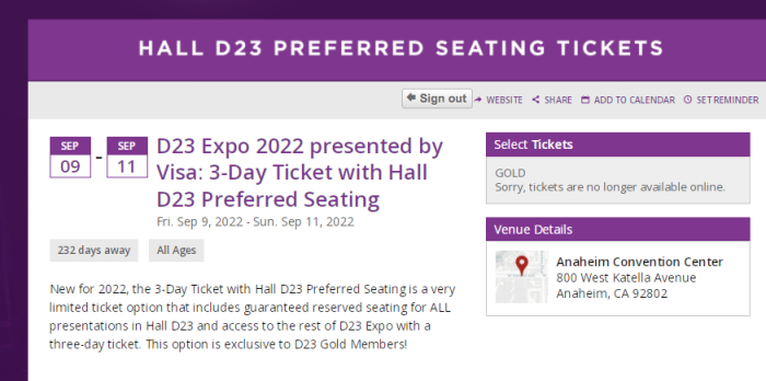 Yep, at the time of writing, Gold Member-exclusive Preferred Seating Tickets for D23 Expo are SOLD OUT. And this was AFTER a virtual queue of thousands.