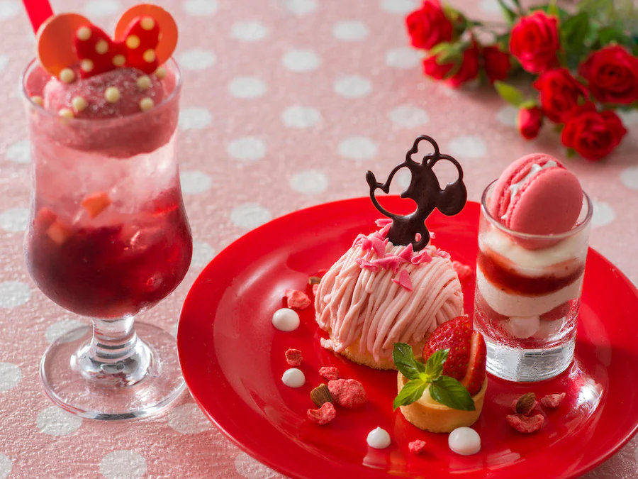More importantly, though, there will be Minnie Mouse-themed food like a dessert and drink set that includes a Strawberry Mont Blanc, a Strawberry-Custard Tartlet and Verinne Topped with a Macaron, and a Strawberry Soda Float that comes complete with a Minnie bow! Seriously, will you LOOK AT THIS? 🤤