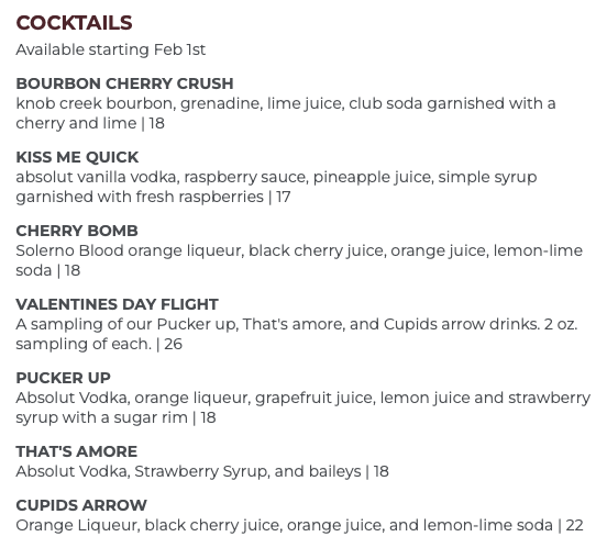 First off, there will be a special array of new cocktails starting February 1st. All of them have fun Valentine’s Day–themed names, and the flavors of cherry, raspberry, and strawberry are all prominently featured.