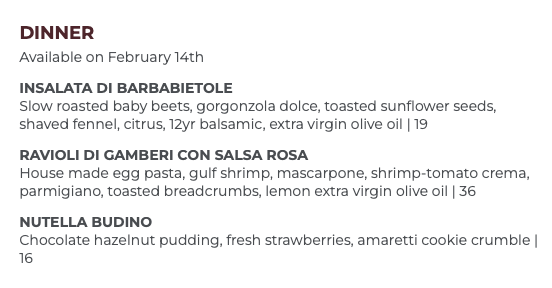 The appetizer is called Insalata Di Barbabietole and includes slow-roasted baby beets with gorgonzola dolce, toasted sunflower seeds, shaved fennel, citrus, balsamic, and olive oil. The entrée is Ravioli Di Gamberi Con Salsa Rosa, and it features house-made egg pasta, gulf shrimp, mascarpone, shrimp-tomato crema, Parmigiano, toasted breadcrumbs, and olive oil. To finish off the meal, you can try Nutella Budino, which is a chocolate-hazelnut pudding with fresh strawberries and an amaretti cookie crumble.