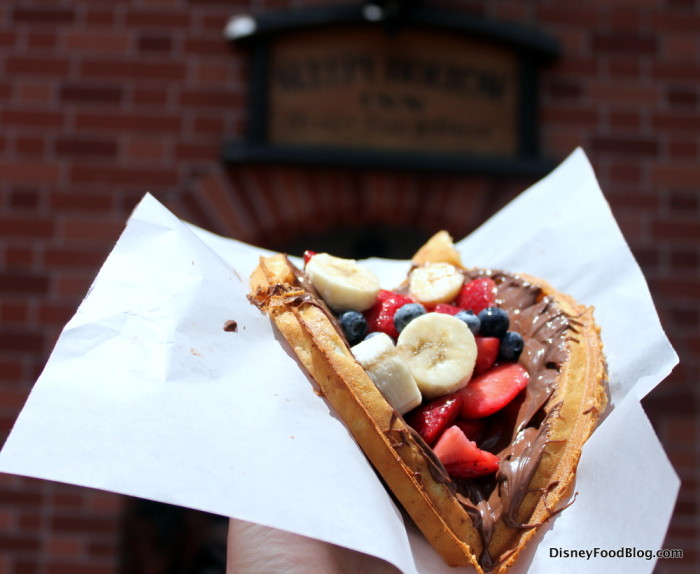 If you love waffles, fruit, and Nutella (or “chocolate hazelnut spread”), Disney has put it all together to create a whopping tasty snack also known as the Fresh Fruit Waffle Sandwich. Not only is this snack delicious, but it is also a HUGE portion size, so you can gather your friends for a feast or save it all for yourself and skip the pricey Quick Service meal.