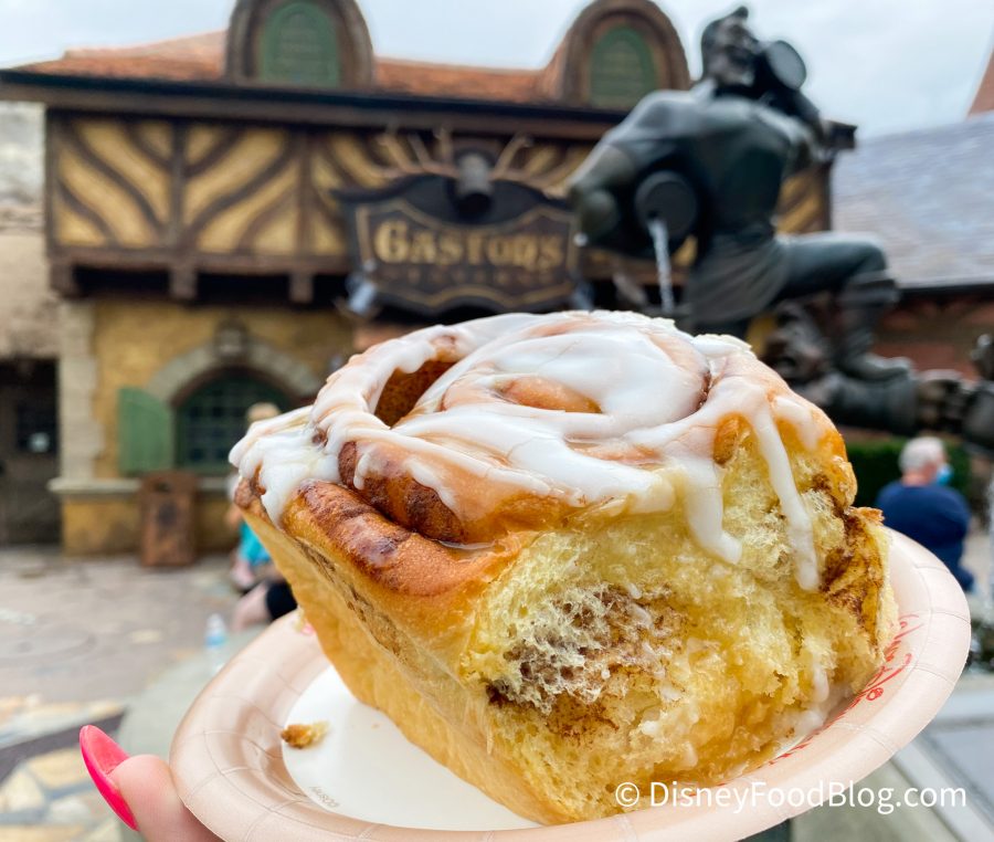 You’ll have to venture to the back of New Fantasyland in Magic Kingdom for this next one, but you just might be happy that you were forced to log a few extra steps to get to the GIANT Warm Cinnamon Roll from Gaston’s Tavern.