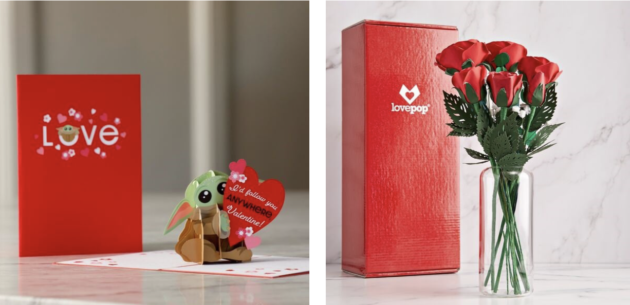 Six red paper roses sit atop their green leafy stems inside of a sturdy box, available while supplies last, through the month of February. There is also a fun and adorable pop-up card featuring Grogu!