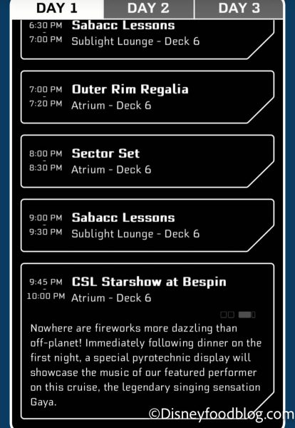 There are a number of things listed on the itinerary that caught our eye, but one of the BIG things we noticed is that “CSL Starshow at Bespin” listed on Day 1 of the itinerary. It notes that it takes place from 9:45-10PM on the Atrium on Deck 6.
