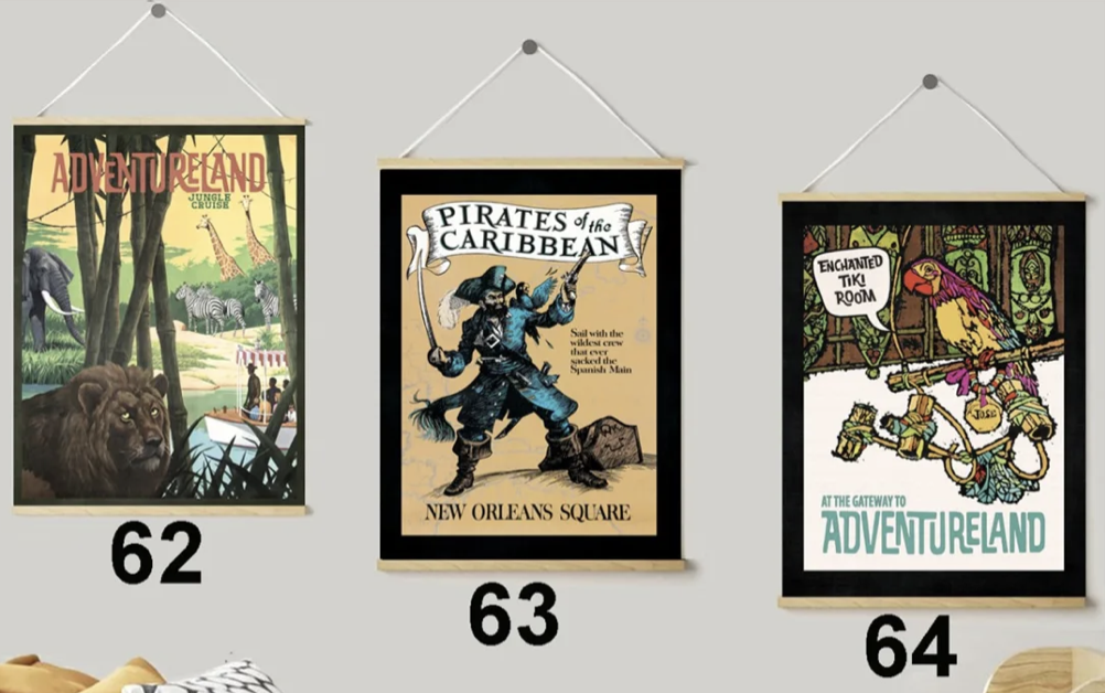 Then, we have these awesome Adventureland prints that show the Jungle Cruise, Pirates of the Caribbean, and the Enchanted Tiki Room!
