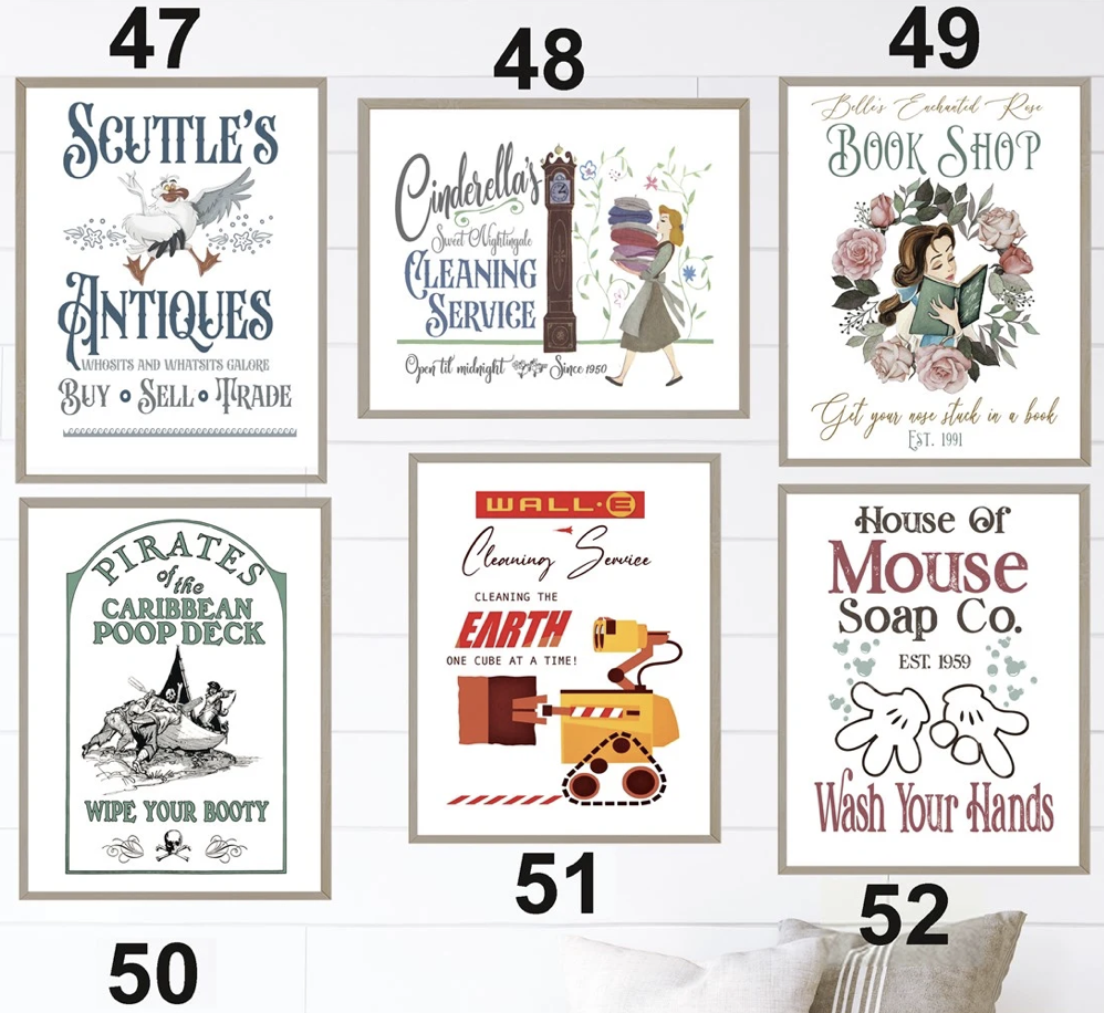 Next, we have these clever prints that have themed different Disney characters to their hypothetical businesses!