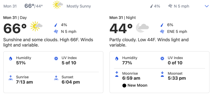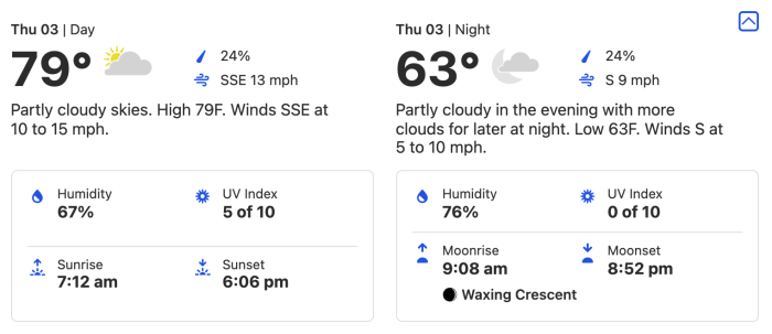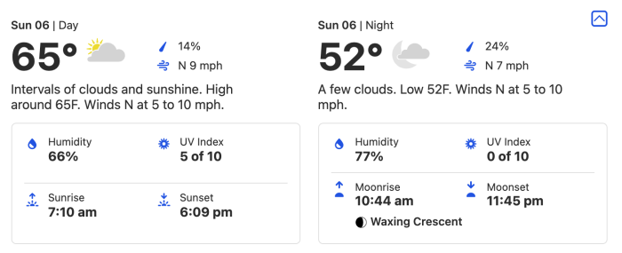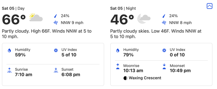 By now, you can probably get a pretty good sense of what to expect for Saturday, February 5th! There’s a 24% chance of precipitation (again!!), winds at 5-10 miles per hour, and humidity in the high 50-70% range.