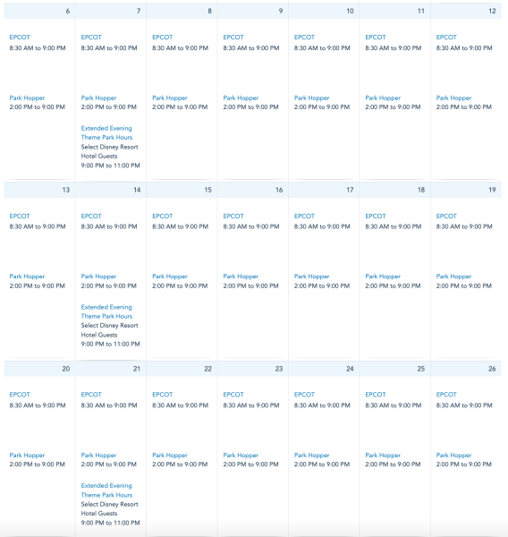 UPDATE: Until February 27th, EPCOT will be open from 10AM-9PM each day. However, starting on the 28th, those hours switch to 8:30AM-9PM. It will remain this way until March 31st.