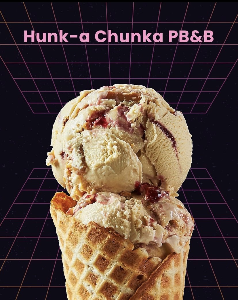 The Hunk-a Chunka PB&B is inspired by Elvis’s favorite flavors! It has a roasted banana ice cream base, marionberry jam, and peanut butter stracciatella. Oh, mama!