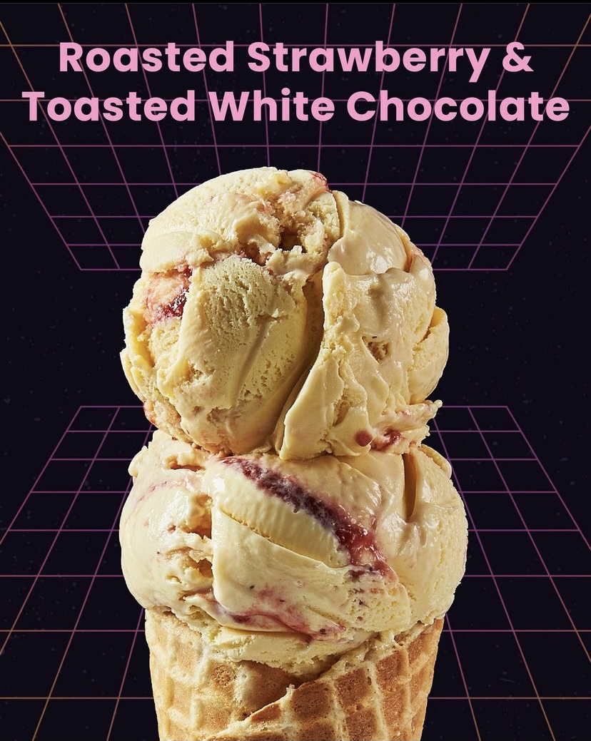 The Roasted Strawberry and Toasted White Chocolate ice cream has a toasted white chocolate ice cream base, and has raw strawberries mixed in.