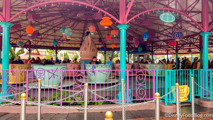 Mad Tea Party in Magic Kingdom is an outdoor ride where guests sit inside teacups and spin in circles, both in place and around the other cups — a true recipe for success for those prone to dizziness, no?! (For a person who is prone to motion sickness, you could say it’s not their cup of tea — get it? 😉)