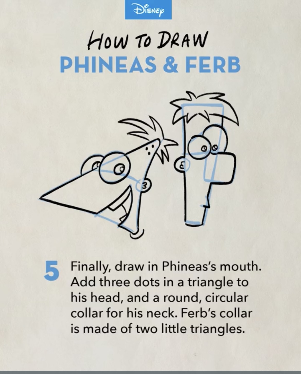 5. Last step — draw in Phineas’s mouth, then add three dots to his head. Finally, draw on both collars.