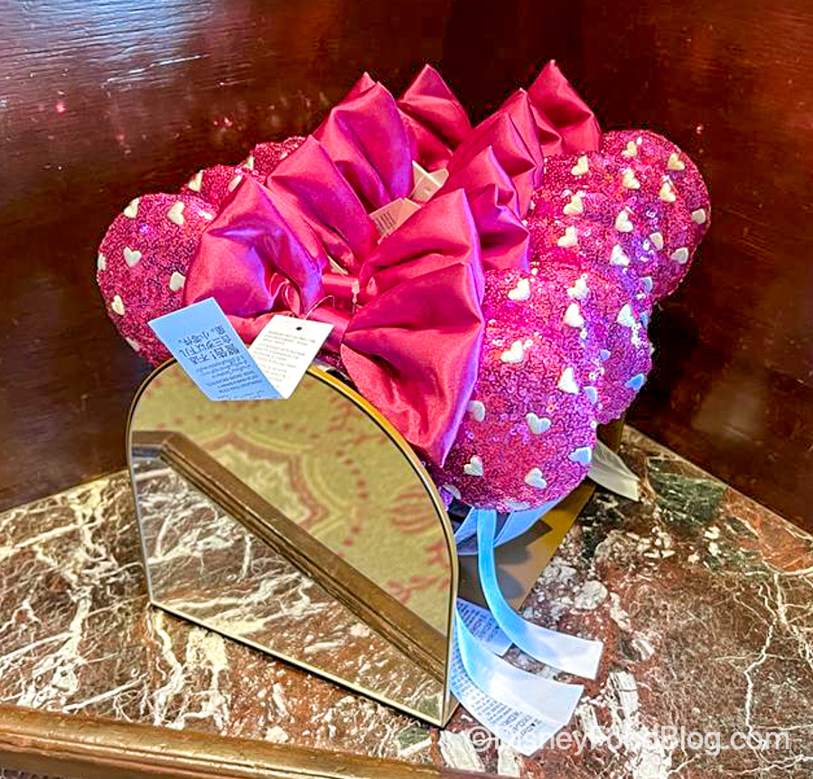 These ears are covered in pink sequins sprinkled with white hearts and have a big pink bow in the center! Minnie herself would be so happy to see so much pink in one place!