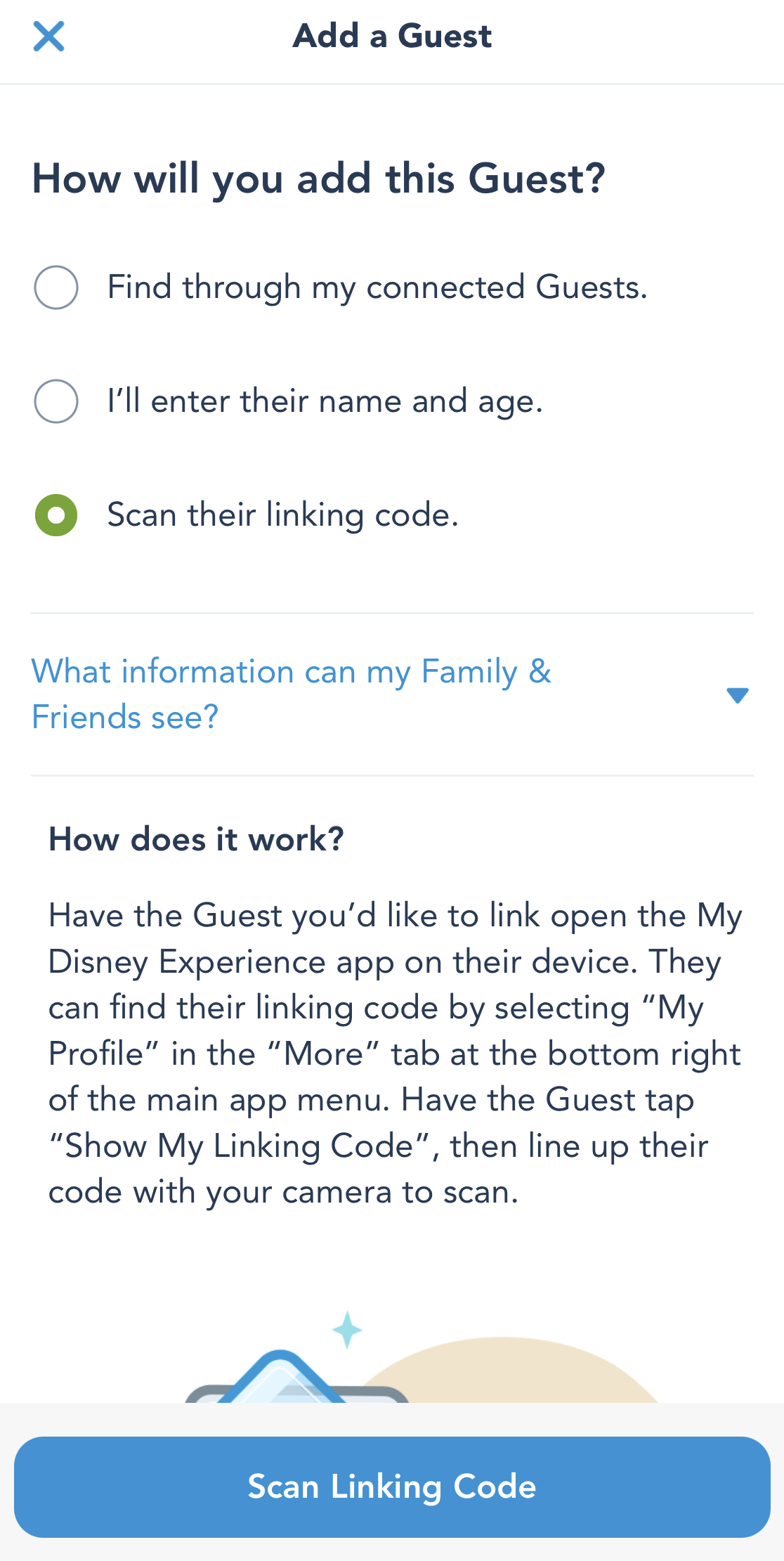 Once you’re there, go to “Show My Linking Code.” Disney will then prompt you with a warning explaining what the linking code is. Essentially it is a QR code. Once someone scans your Linking Code, you’ll be added to their Friends & Family list.