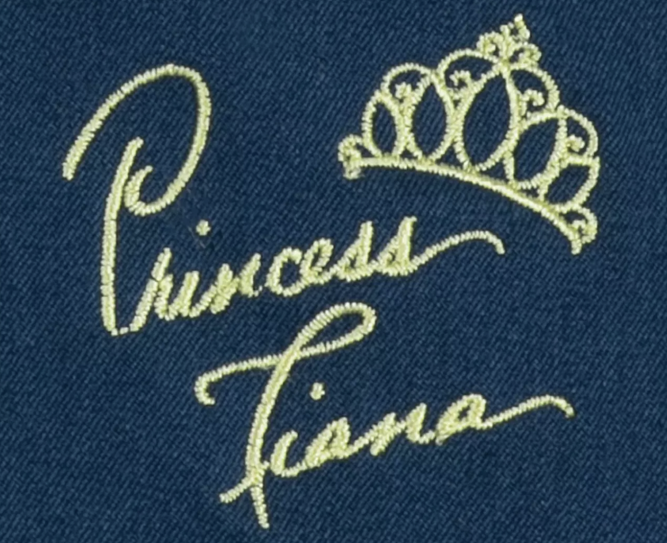 And, there is a golden embroidered “Princess Tiana” signature and tiara icon on the back of the dress on the top right shoulder.