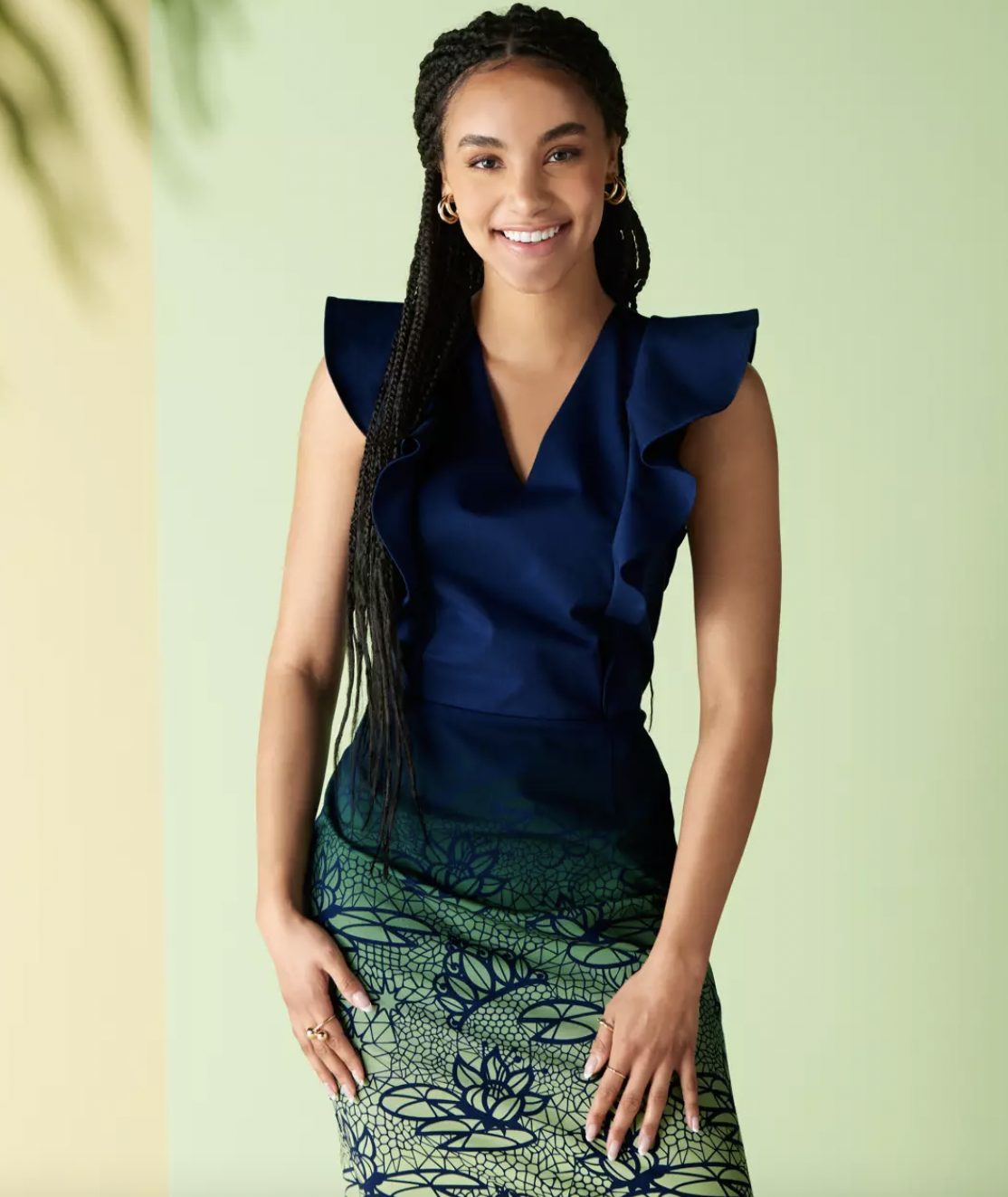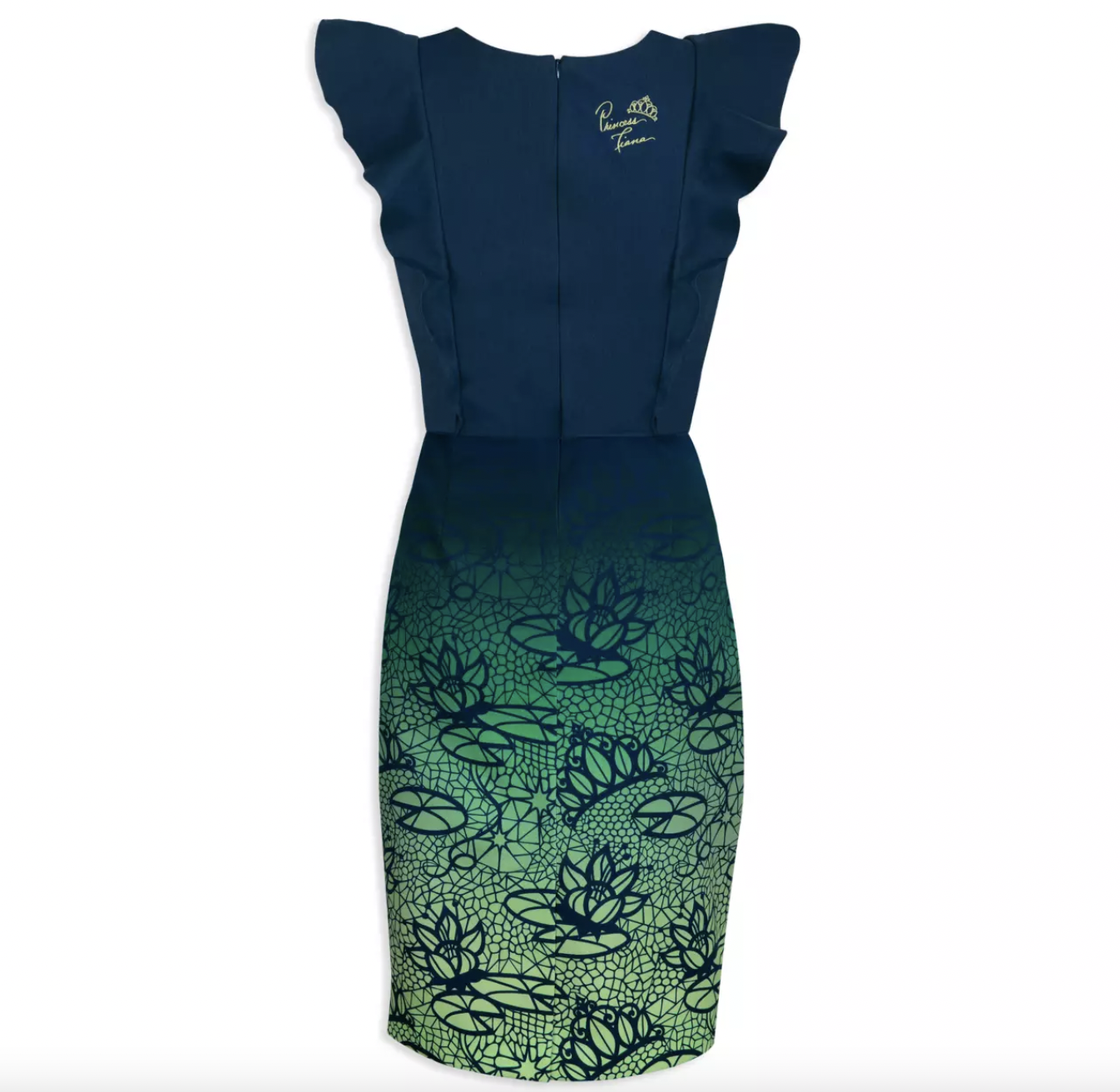 The pattern on the skirt is really fun, too! The blue top of the dress fades down into Princess Tiana’s signature green and has a lily-pad print all over the skirt. You can even see Tiana’s crown!