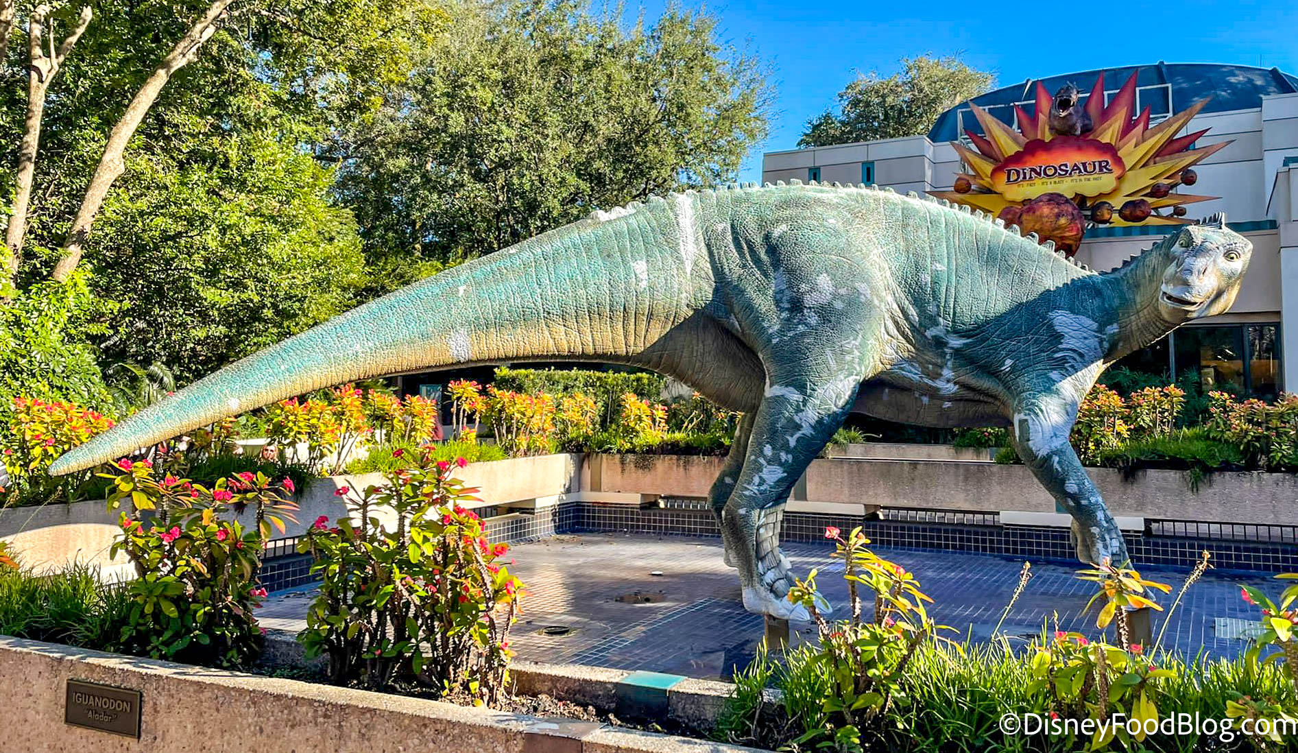 Aladar, the Igunodon from the 2000 film Dinosaur, is undergoing a bit of a rough time. At the moment, if you pass by him, you might be surprised to see just how rough he looks! You can find Aladar in front of the Dinosaur ride in DinoLand U.S.A. We’ll be keeping an eye out for updates on this friend.