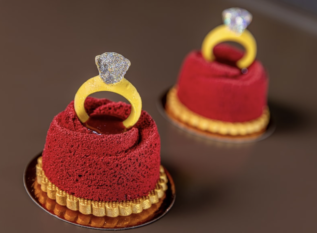 - Engagement Ring Cake: Chocolate cake filled with raspberry sauce atop a shortbread cookie complete with a white chocolate engagement ring (Plant-based) (New)