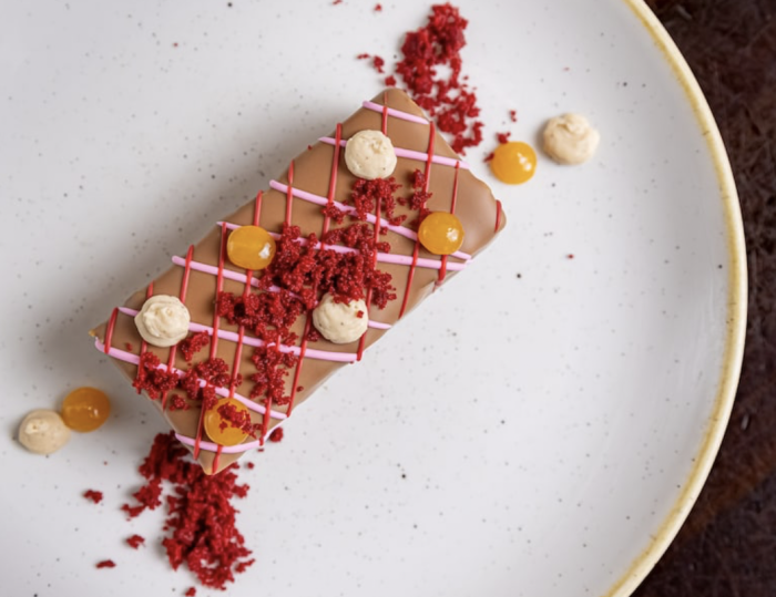 - Valentine’s Day Candy Bar: Coconut, apricot, caramel, pistachio, and cashew bar coated with milk chocolate and topped with chai cream, red velvet crumbs, and raspberry gel