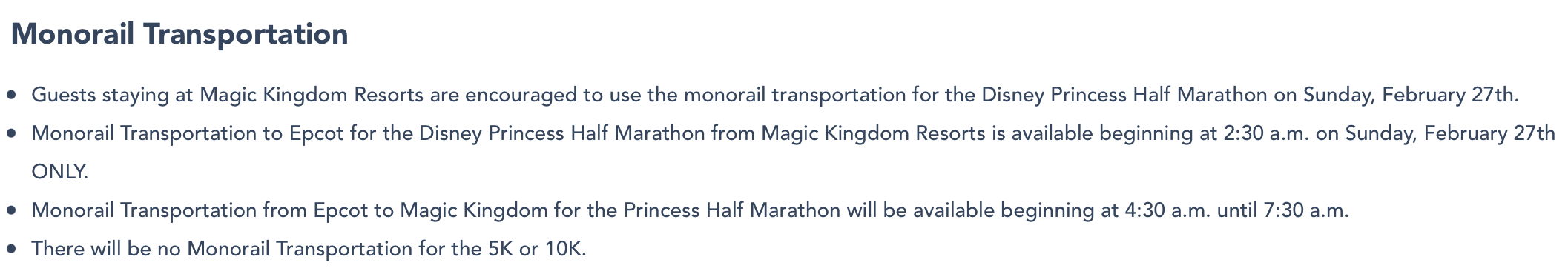 Disney has also said that people staying at the Magic Kingdom Resorts are encouraged to use the Monorail to get to the Half Marathon on Sunday. This only applies on Sunday — the Monorail will not be available for the 5K or the 10K.